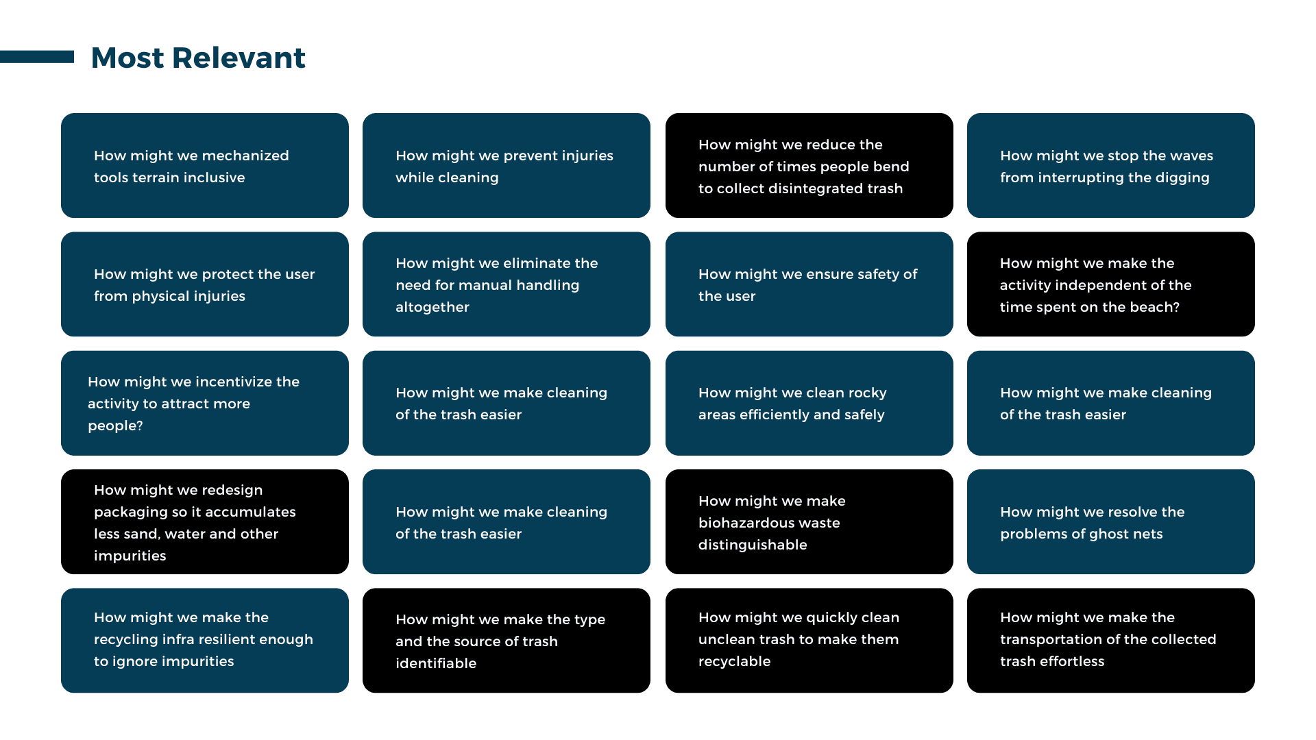 Our team conducted a structured ideation exercise focused on beach clean-up challenges. We explored four key problem areas through "How Might We" (HMW) questions, generating over 130 concept sketches across the team.