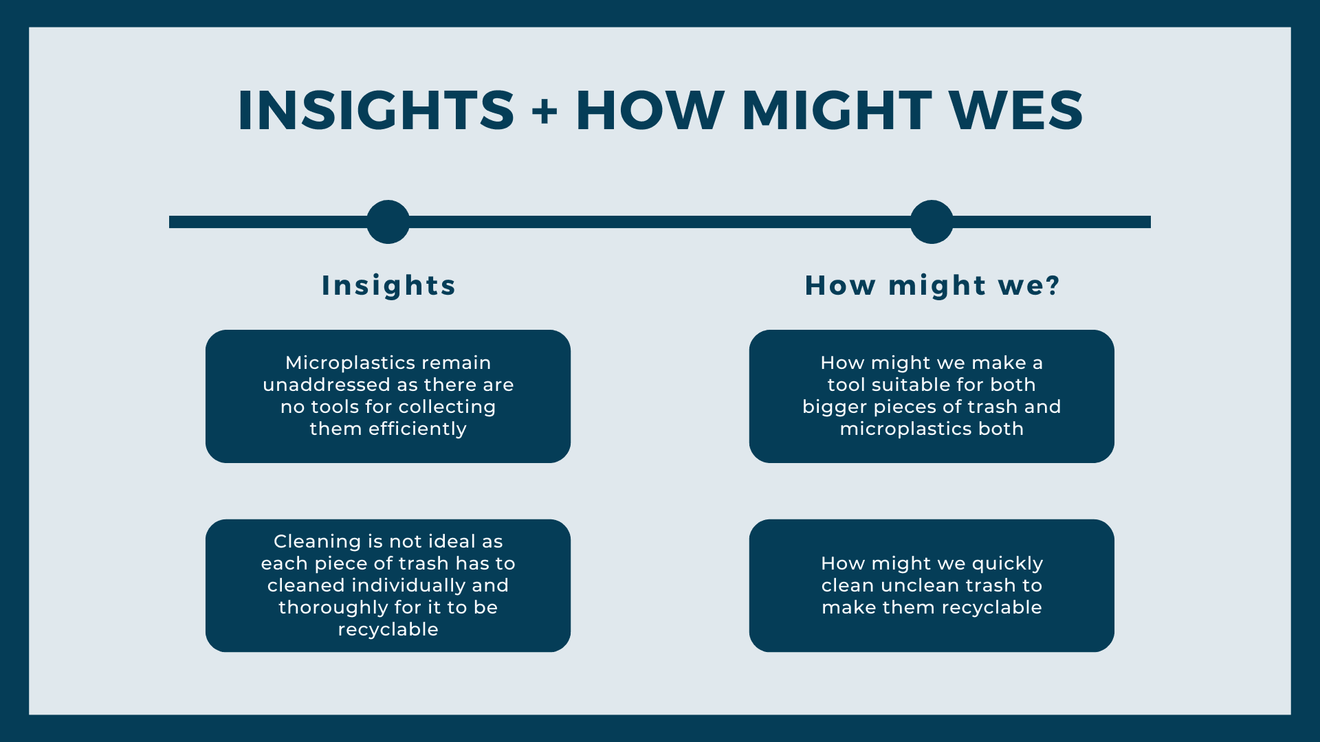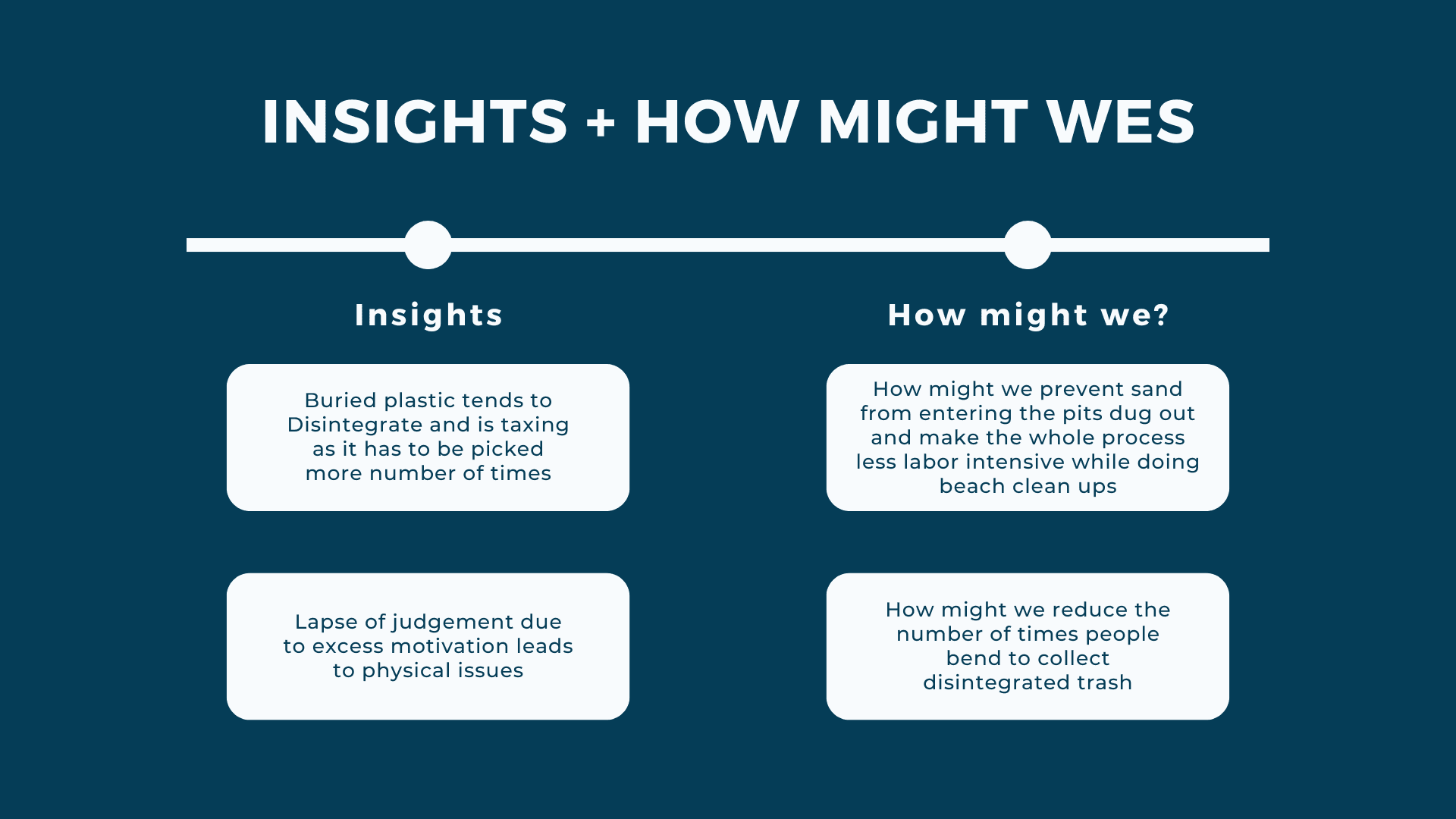 Our research process successfully identified critical pain points through comprehensive primary and qualitative research with active beach cleaners, leading to SNIGER - a mechanical tool that directly addresses the most urgent needs of reducing repetitive bending and preventing sand contamination. The structured ideation and four-stage selection process was effective in narrowing 130+ concepts to a viable solution. However, we have significant gaps including limited prototype testing, unclear performance on wet sand and microplastics collection, undefined material specifications and costs, and awaiting feedback from key stakeholders like Afroz Shah and Chinu Kwatra. The design appears optimized for individual volunteers on dry sand but doesn't fully address all four HMW questions, particularly the cleaning mechanism for recyclability.
